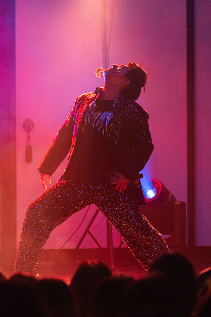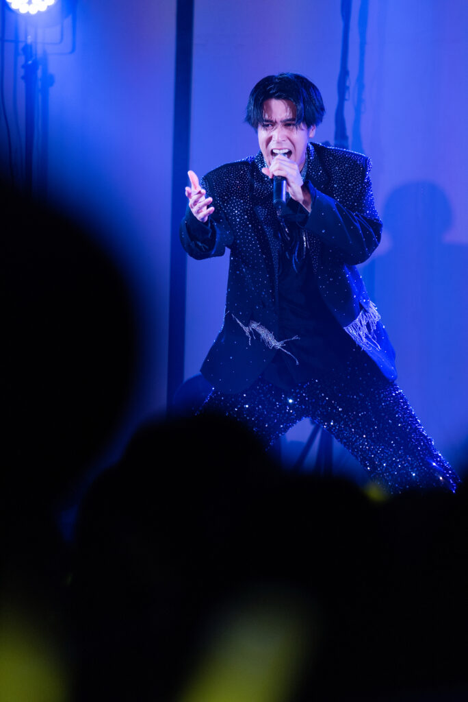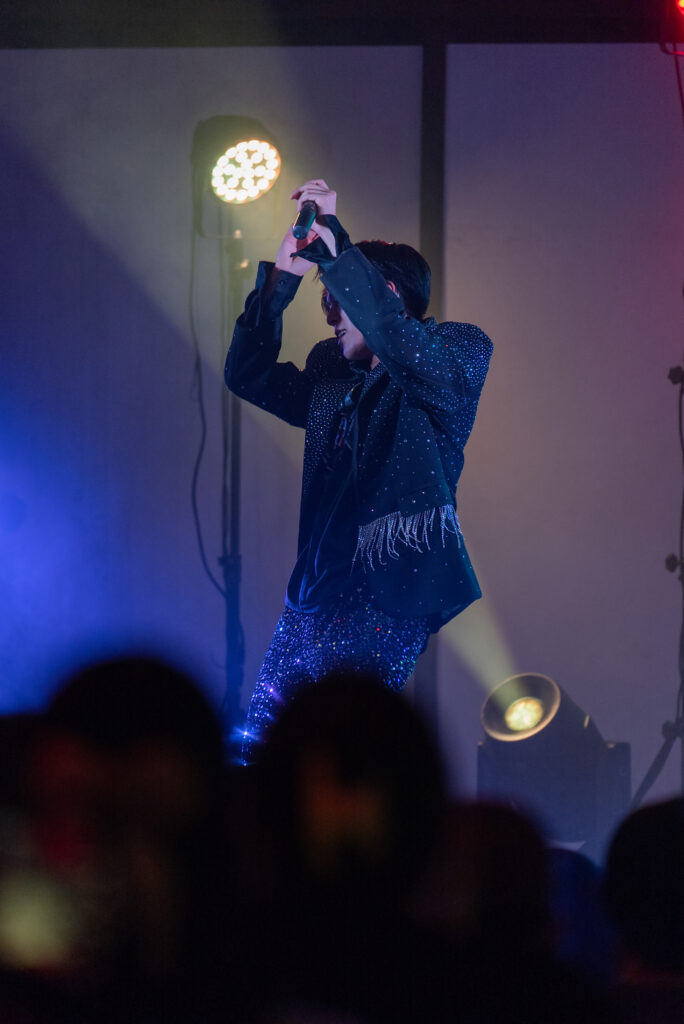 細部までキレのあるパフォーマンスで、 “歌も踊りも本気でやる”という彼のスタンスがはっきりと伝わる。 スパンコールの衣装がステージの光を拾い、ステージにライブならではの躍動感が生まれる。
